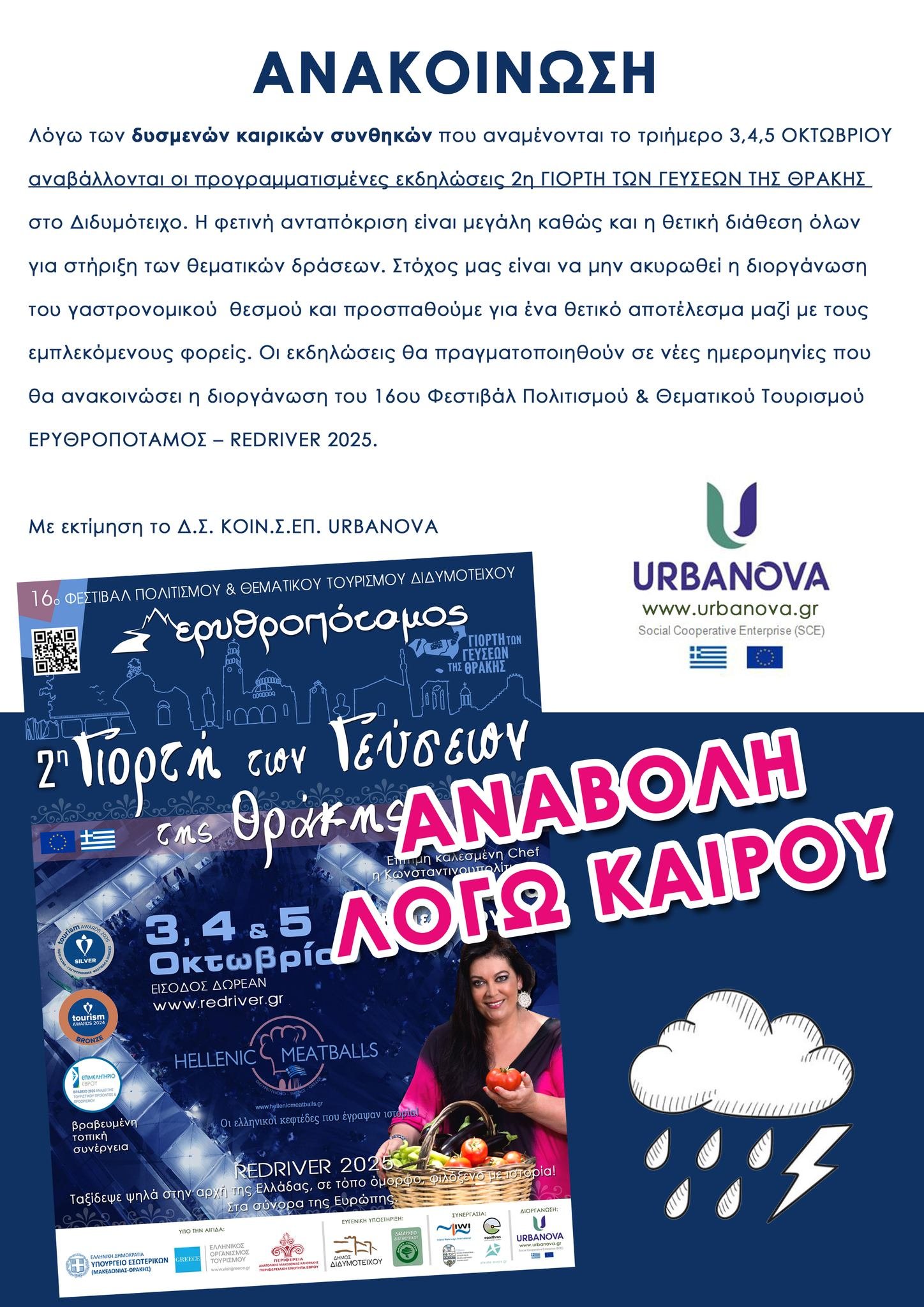 Λόγω των δυσμενών καιρικών συνθηκών που αναμένονται το τριήμερο 3,4,5 ΟΚΤΩΒΡΙΟΥ  αναβάλλονται οι προγραμματισμένες εκδηλώσεις της 2η ΓΙΟΡΤΗ ΤΩΝ ΓΕΥΣΕΩΝ ΤΗΣ ΘΡΑΚΗΣ στο Διδυμότειχο.