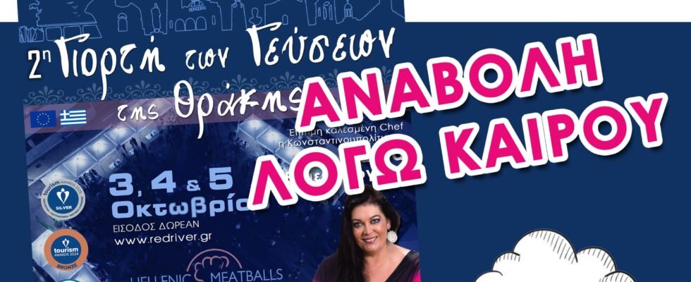 Λόγω των δυσμενών καιρικών συνθηκών που αναμένονται το τριήμερο 3,4,5 ΟΚΤΩΒΡΙΟΥ  αναβάλλονται οι προγραμματισμένες εκδηλώσεις της 2η ΓΙΟΡΤΗ ΤΩΝ ΓΕΥΣΕΩΝ ΤΗΣ ΘΡΑΚΗΣ στο Διδυμότειχο.
