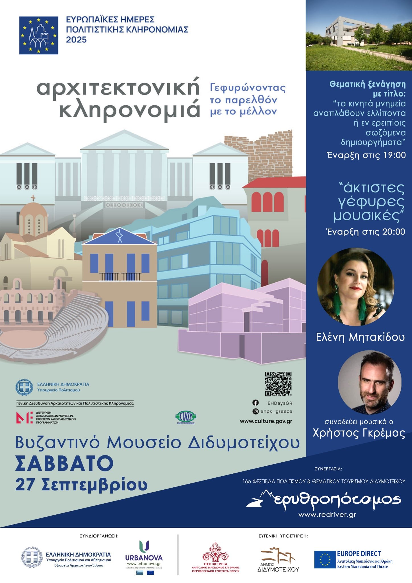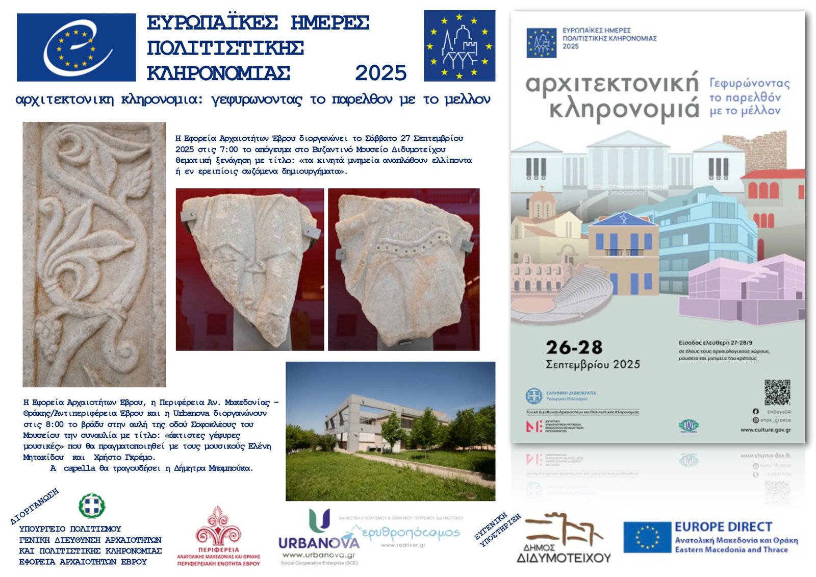 ΣΑΒΒΑΤΟ 27 Σεπτεμβρίου, ώρα 19:00 θεματική ξενάγηση και ώρα 20:00 μουσική παρουσίαση στο Βυζαντινό Μουσείο Διδυμοτείχου // EUROPEAN HERITAGE DAYS – EHD
